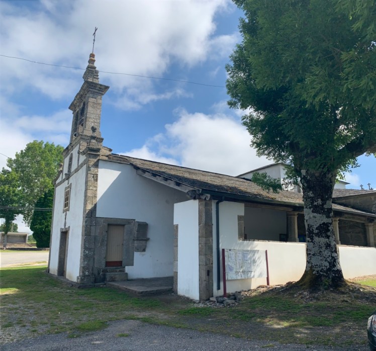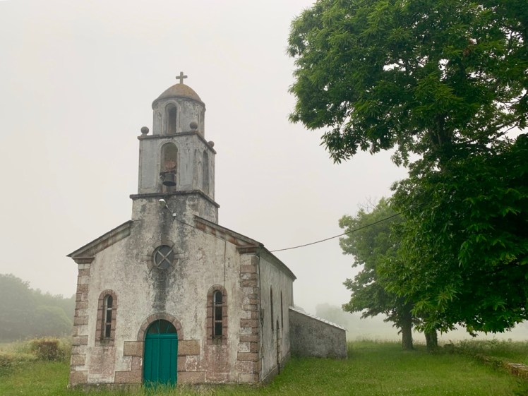 Smette di piovere, Gianfranco si libera della mantella. Usciamo da un piccolo bosco di betulle battuto dal vento e sulla nostra sinistra intravediamo in lontananza una chiesetta avvolta nella nebbia. Facciamo una piccola deviazione per vederla da vicino. È la chiesetta di San Pedro in Candia. È purtroppo abbandonata, lo si capisce dall’erba alta che cresce davanti all’ingresso.