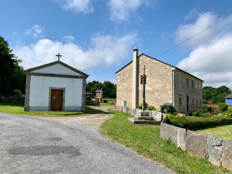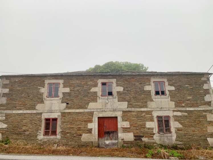 Di fianco, noto le tipiche lastre di ardesia infilate verticalmente nella terra, a mo’ di muretti a secco, che delimitano le proprietà. Sono un uso caratteristico della Galizia.