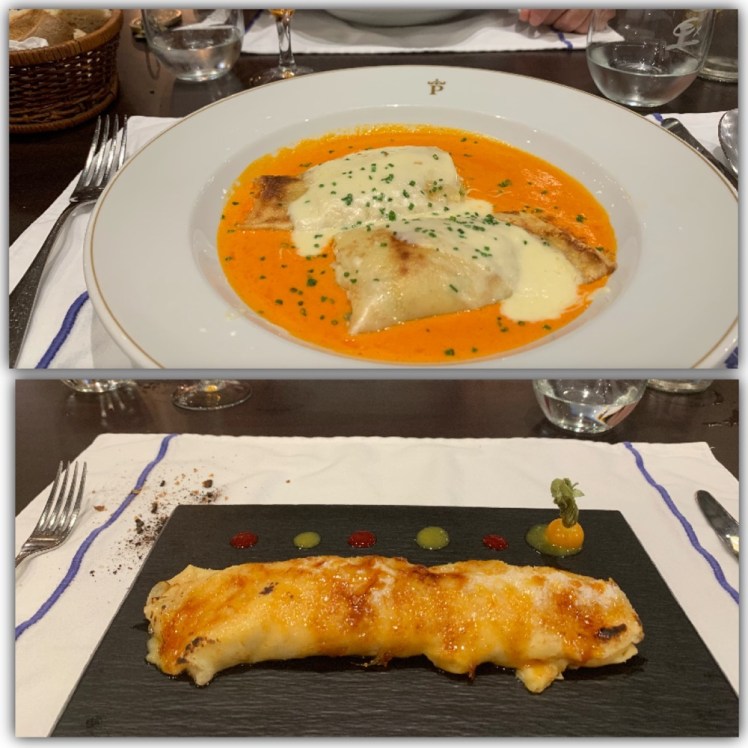 A cena, delle crespelle ripiene di pesce e formaggio di Arzua con crema ai… peperoni!