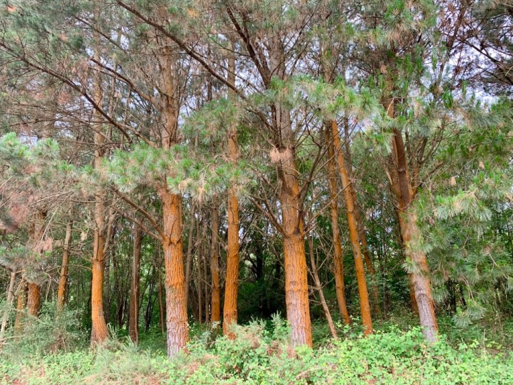 Proprio sul ciglio della strada, noto delle belle conifere dalla corteccia rossa, mi sembrano alberi di pino silvestre, ma non ne sono certa.