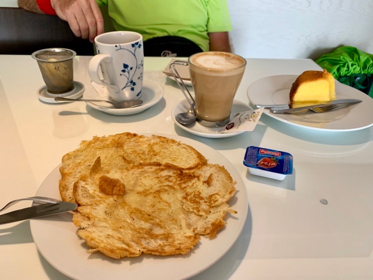 A circa 7 km dalla partenza, troviamo un bar aperto e finalmente si fa colazione! Scelgo un croissant alla plancha e un buon caffè.