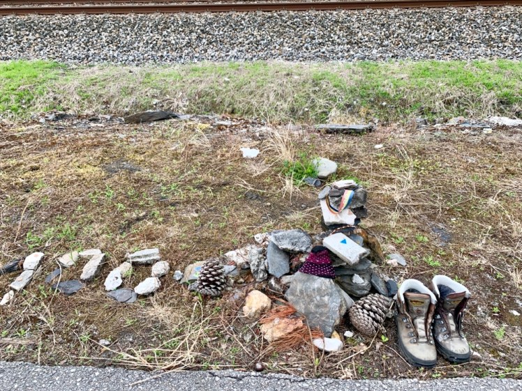 Di fianco al mojon, i pellegrini di passaggio lasciano un sasso ricordo o piccoli oggetti. Qualcuno ha lasciato addirittura gli scarponi.