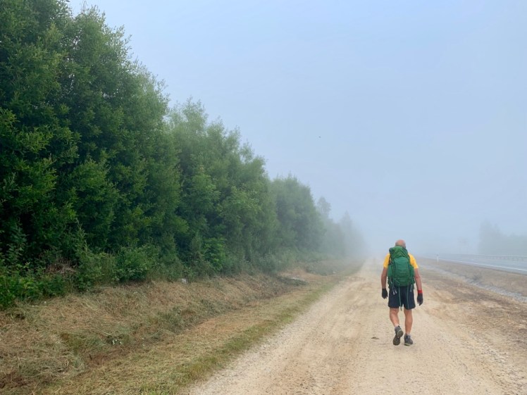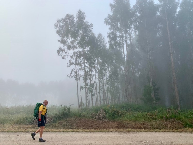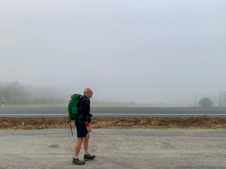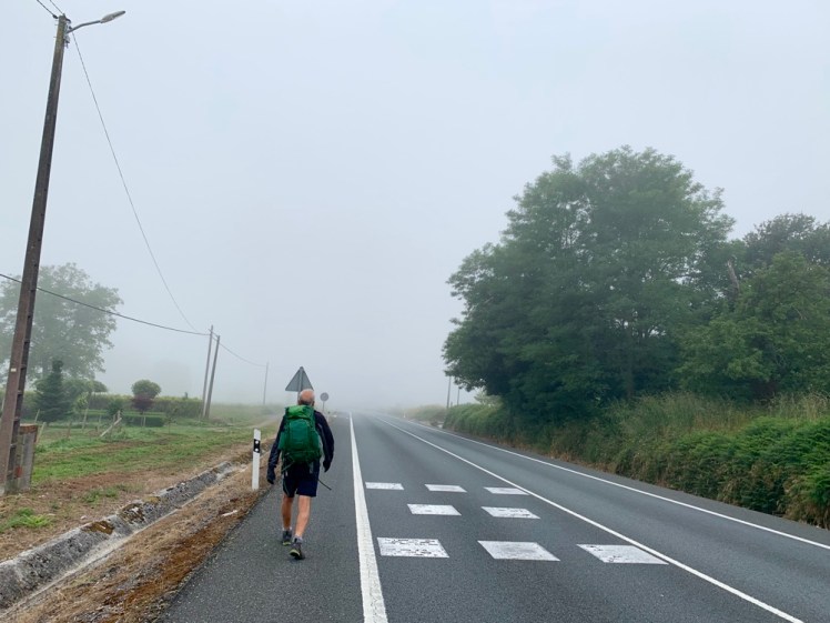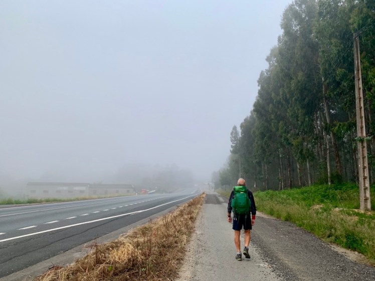 Ci immettiamo di nuovo sulla N-634, immersi nella nebbia. Fa freddo e la nebbia ci bagna la pelle. Il traffico è scarso, ma passano in maggioranza TIR. Bisogna fare attenzione, perché la nebbia si sta infittendo e siamo sempre meno visibili.