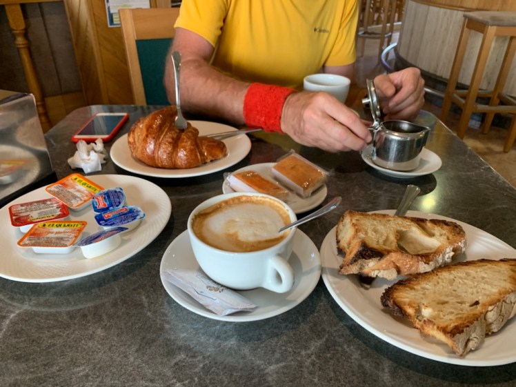 Al termine di un lungo rettilineo di cui non si vede la fine, a causa della nebbia, appare improvvisamente un bar sulla nostra destra, dall’altra parte della strada. Lì per lì non capiamo se è aperto, ma poi sentiamo delle voci provenire dall’interno. Attraversiamo la strada ed entriamo. Finalmente colazione!