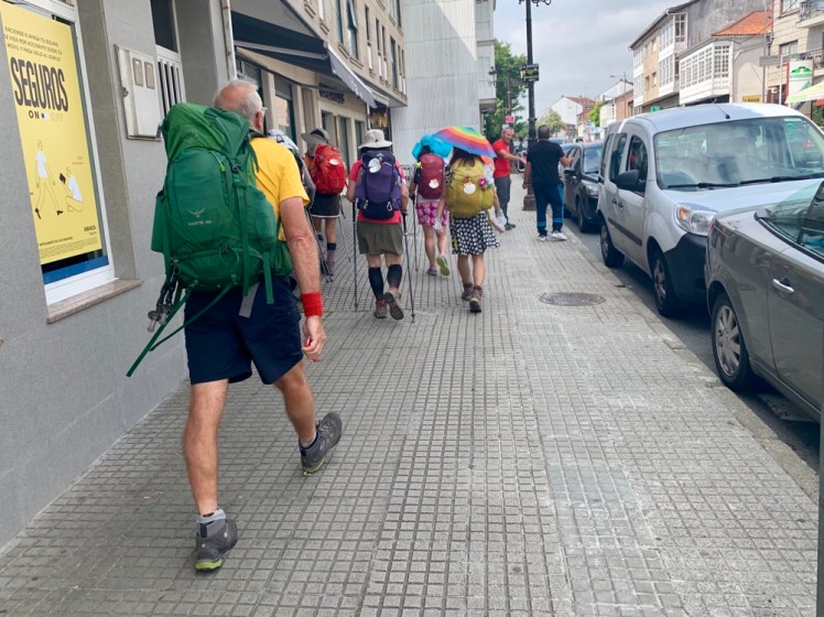 Entriamo sulla N-547 e dopo 500 metri, eccoli! Siamo a O’Pedrouzo e i pellegrini sbucano dal sentiero ufficiale, come formiche dal nido, sono stanchi, sconvolti dalla fatica.