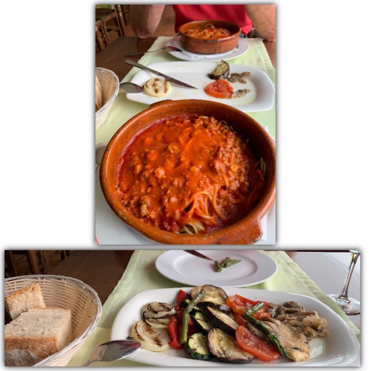 E buon pranzo è stato! Ho scelto degli spaghetti al ragù che… mi hanno resa felice! Insieme, anche verdure alla griglia. Verdure che credevo avrei ritrovato solo a casa: zucchine, melanzane, asparagi freschi, funghi e gli immancabili peperoni.